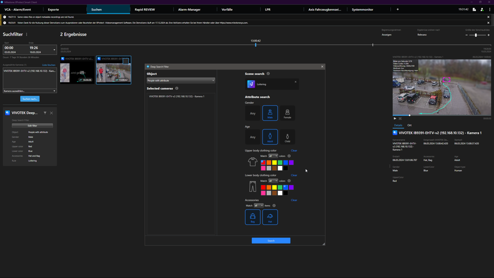 Mit Vivotek Deep Search kann man die forensische Suche mit Szenensuche und Attributsuche kombinieren um die Suche auf relevante Objekte zu beschränken.