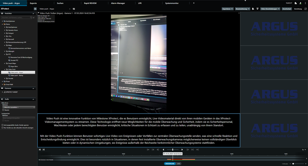 Mit der Video Push-Funktion können Benutzer sofortiges Live-Video von Ereignissen oder Vorfällen zur zentralen Überwachungsstelle senden, was eine schnelle Reaktion und Entscheidungsfindung ermöglicht. Dies ist besonders nützlich in Situationen, in denen fest installierte Überwachungskameras möglicherweise keinen vollständigen Überblick bieten oder in dynamischen Umgebungen, wo Ereignisse außerhalb der Reichweite herkömmlicher Überwachungssysteme stattfinden.
