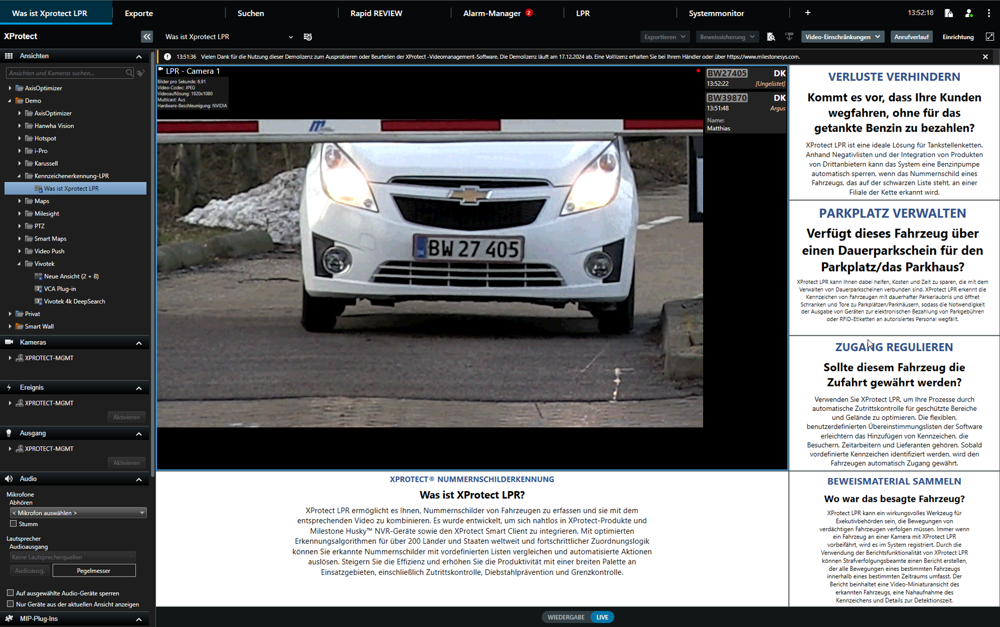 XProtect LPR ermöglicht es Ihnen, Nummernschilder von Fahrzeugen zu erfassen und sie mit dem entsprechenden Video zu kombinieren. Es wurde entwickelt, um sich nahtlos in XProtect-Produkte und Milestone Husky™ NVR-Geräte sowie den XProtect Smart Client zu integrieren. Mit optimierten Erkennungsalgorithmen für über 200 Länder und Staaten weltweit und fortschrittlicher Zuordnungslogik können Sie erkannte Nummernschilder mit vordefinierten Listen vergleichen und automatisierte Aktionen auslösen. Steigern Sie die Effizienz und erhöhen Sie die Produktivität mit einer breiten Palette an Einsatzgebieten, einschließlich Zutrittskontrolle, Diebstahlprävention und Grenzkontrolle.