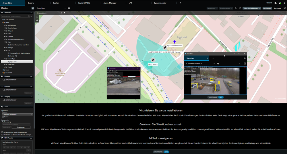 Bei großen Installationen mit mehreren Standorten ist es fast unmöglich, sich zu merken, wo sich die einzelnen Kameras befinden. Mit Smart Map erhalten Sie Echtzeit-Visualisierungen der Installation. Jedes Gerät zeigt seine genaue Position, seinen Status und seine Sichtfelder an.