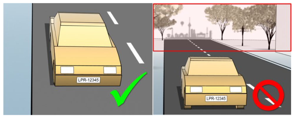 Sind zu viele irrelevante Elemente im Bild, beeinträchtigen sie die Erkennung und der LPR-Server nutzt die CPURessourcen zur Analyse irrelevanter Elemente statt von Nummernschildern.