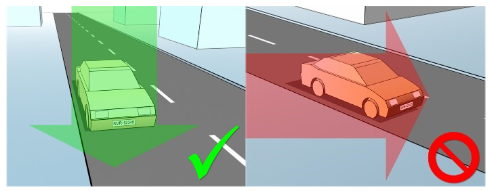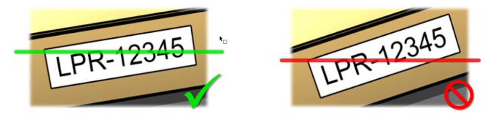 Montieren Sie die Kamera so, dass Sie eine horizontale Linie ziehen können, die sich in den erfassten Bildern über die linke und rechte Kante des Nummernschildes erstreckt. In den folgenden Abbildungen sind korrekte und falsche Winkel zur Erkennung dargestellt.