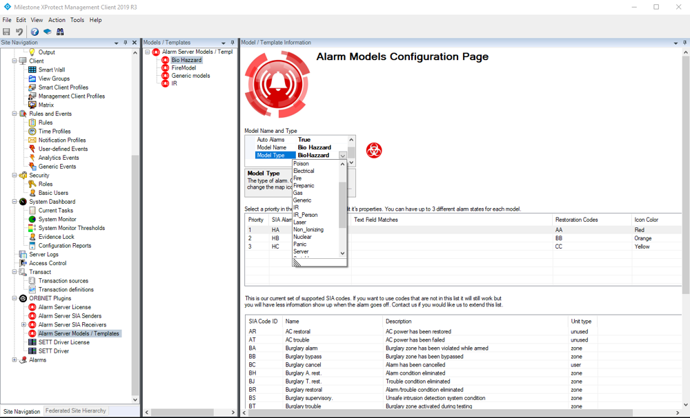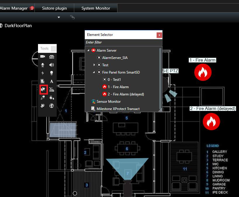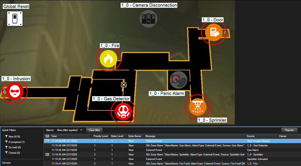 Orbnet hat generische Vorlagen und Modelle erstellt, die es Ihnen ermöglichen, jeden beliebigen Alarmpunkt (Paniktaste, IR-Sensor, Tür, etc.) zu Milestone hinzuzufügen, für jeden ein spezifisches Symbol zu wählen und sie auf den XProtect Legacy-Karten zu verwenden.