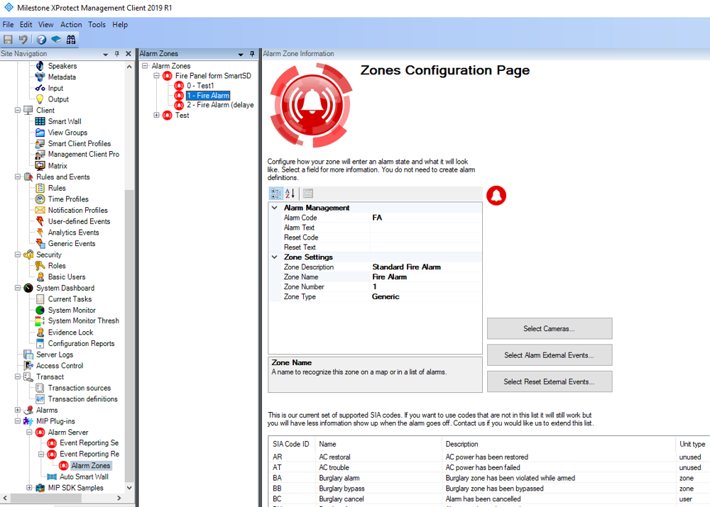 - SIA-DCS-Alarmempfänger: Sie können bis zu 1000 Alarmpunkte pro Alarmzentrale konfigurieren und diese als Sensoren auf XProtect-Karten